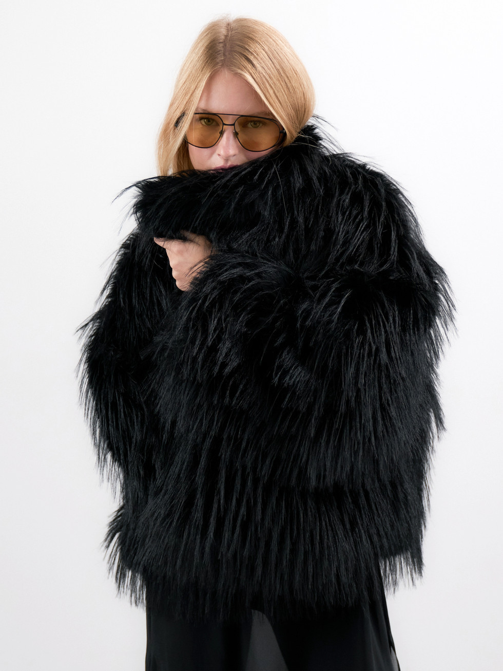Short faux fur coat in black. Designed with a high stand-up collar and front fastening with concealed fur hooks. Clean silhouette with modern proportions. A versatile piece that adds structure and texture to winter looks.
