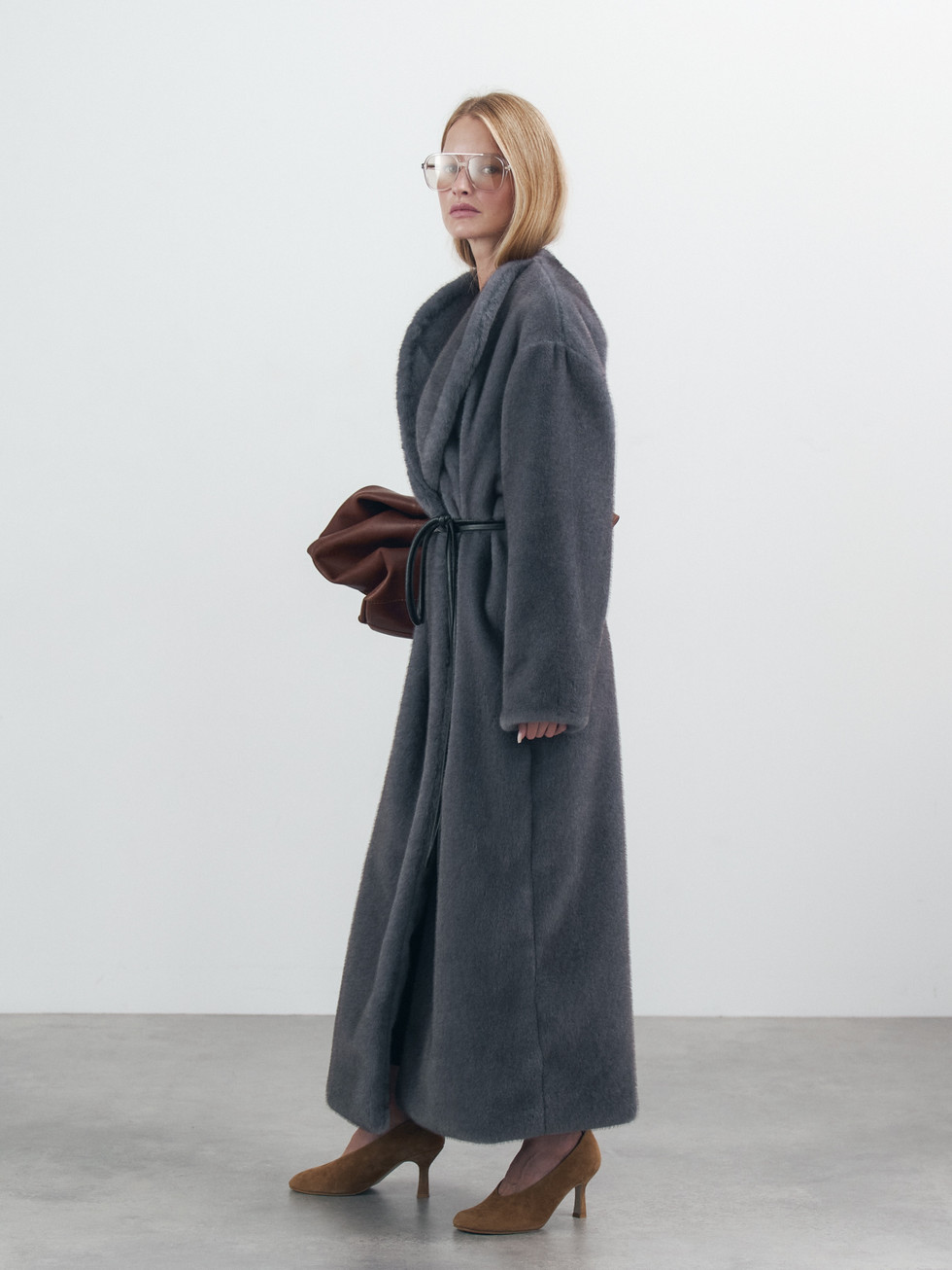 Long faux fur coat in deep graphite. Minimalist silhouette with hidden closure and a slim leather belt. Soft, warm, and effortlessly refined.