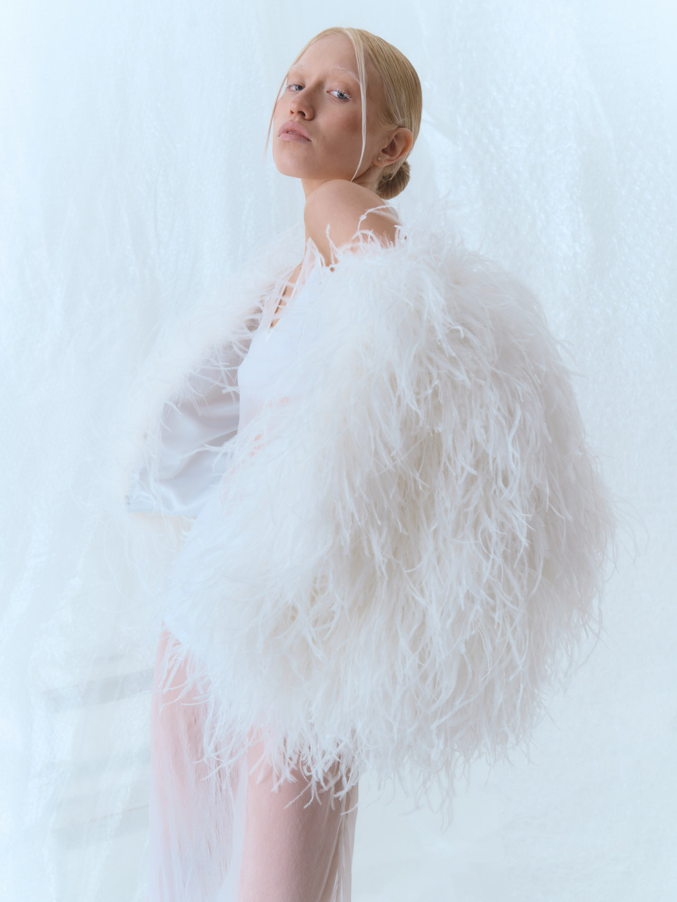 Шуба ручної роботи з пір’я страуса. Має прямий крій, застібається на шубні гачки. Універсальна посадка підходить для будь-якого типу фігури.